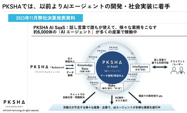 上記は23年11月のパークシャ決算資料。当時AIエージェントの数を「約6000体」と表記していたが「現在は約7000体に増えている」(株式会社PKSHA Workplace 執行役員 山本健介さん)と説明された。
