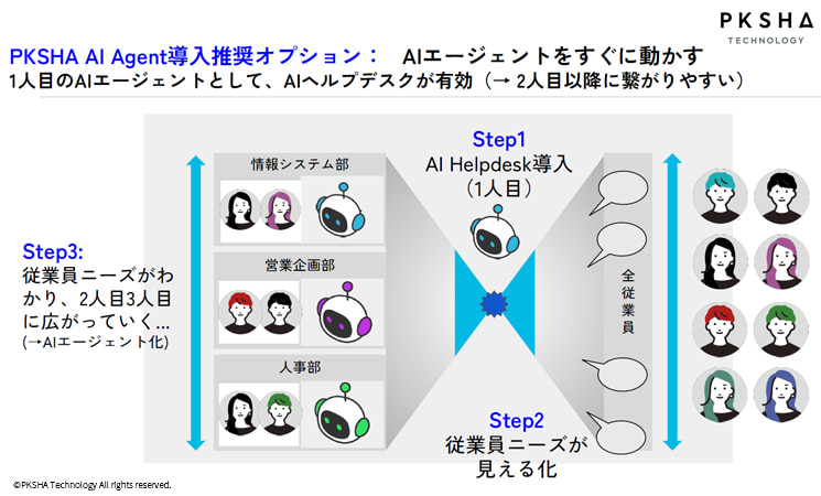 1人目のAIエージェントが働き始めると、AIエージェント上で対話データなどが解析され、潜在的な従業員ニーズが明らかになる。従業員ニーズが分かると、2人目3人目と拡がりやすいそうだ。