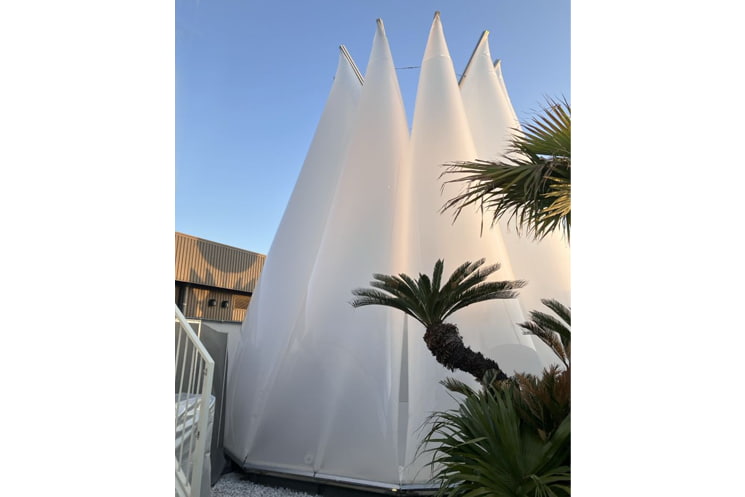 「太陽のつぼみ」という名の通り、花が開くような形状をしたサウナ空間が特徴。サウナ内部に自然光がたっぷりと降り注ぐように、軽量で高い断熱性と柔軟性を持つ「特殊な膜(ETFEフィルム)」が採用されていたり、3Dプリンター技術で作った水風呂があったり、繊細で力強い膜の技術と、自然の力が織りなす全く新しいタイプのサウナだ。