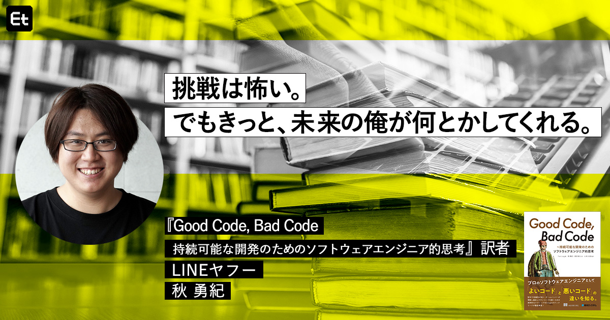 そんな「新たな一歩」を踏み出すためのヒントとなり得る体験談を聞かせてくれたのが、LINEヤフーのモバイル・ディベロッパーエクスペリエンス開発チームで働く秋勇紀さん 。書籍『Good Code, Bad Code ~持続可能な開発のためのソフトウェアエンジニア的思考』(秀和システム)の翻訳者としてご存じの読者も多いだろう。