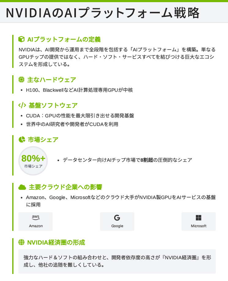 しかしご存じの通り、現在のNVIDIAは、AIインフラを構築し業界をリードする『AIプラットフォーム企業』へと姿を変えました。設立時の時代背景を考えると、どこか皮肉めいた巡り合わせを感じます」