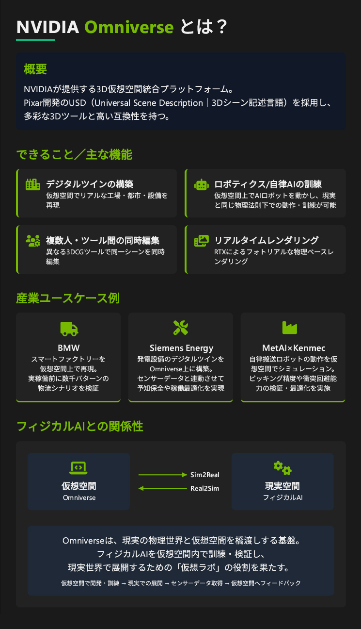 ロボットの頭脳となるAIの強化学習なども、全て仮想空間上で、現実の物理法則を再現しながら何万回、何百万回と繰り返す。そこで完璧に鍛え上げたAIを、現実のボディに搭載するのです。