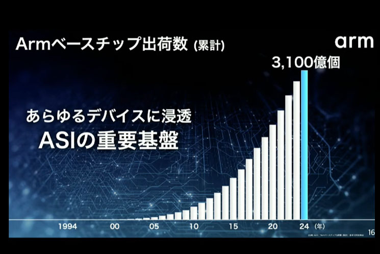 この設計図に基づいて様々なチップメーカーがチップを製造しており、その累計出荷数はなんと3000億個に達しています。しかも、その数は二次曲線を描いて伸び続けているのです。