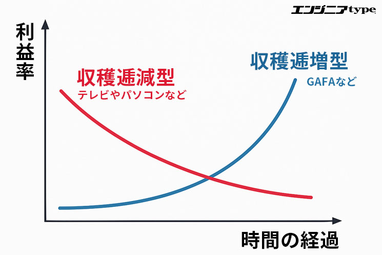 もう一つは、「収穫逓増型」(しゅうかくていぞうがた)の事業です。これは、時間の経過とともに勝者がますます強くなり、利益を独占していくタイプの事業です。現代のプラットフォーマー企業、いわゆるGAFAなどがこの典型で、時間の経過とともに産業基盤を強固にし、利益を増やしていきます。