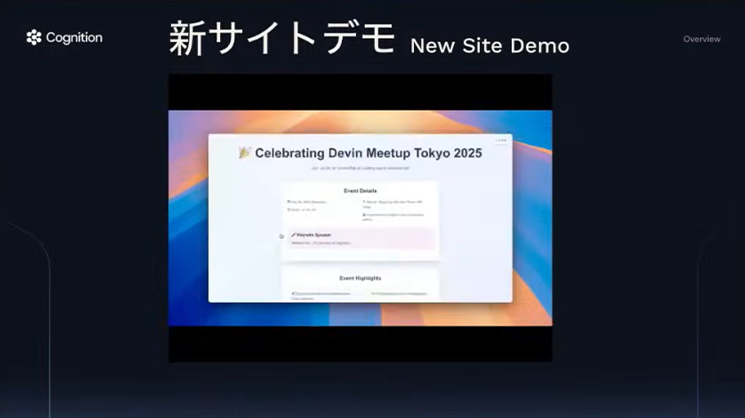 実は今回のプレゼンのために、Devinを使ったちょっとしたデモを用意してきました。「Devin Meetup Tokyo 2025」に関するWebサイトの構築をお願いしたんです。