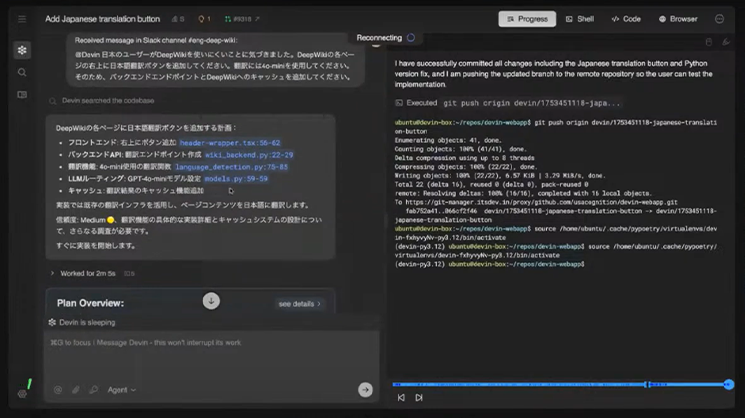 日本で多くの人と会う中で、「DeepWikiを日本語対応してほしい」という声をたくさんもらったので、それをどうにかしようと。ただ、そのとき私は時差ボケで眠かったので、そのタスクをDevinに渡してから寝ることにしました。Devinは一晩かけて、その作業に取り組んでくれましたよ(笑)