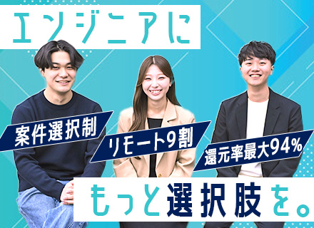 勤務地 全国の案件先にて稼働(リモート率87%) \案件は「100%選択制」なので、理想の働き方が可能!/ フルリモート・ハイブリット・フル出社から選択可能です。フルリモ率66%! ※案件は100%選択制