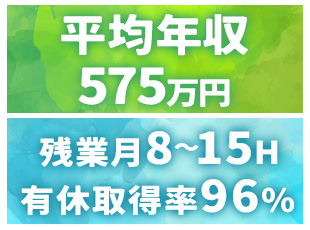 給与 ★年収577万円・28歳|619万円・30歳 ★モデル月収:28万円(月給+残業代+各種手当)/入社2年目 ★賞与年3.6ヶ月分 月給21万円~25万円+賞与年2回(年3.6ヶ月分支給/昨年度実績)