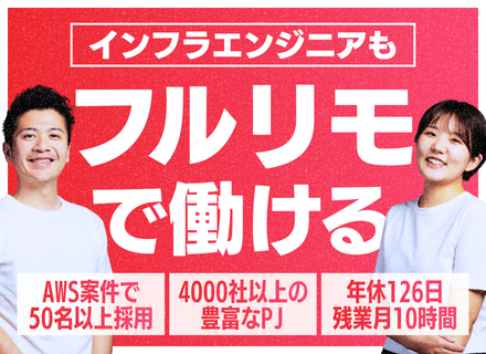 勤務地 ★フルリモートOK ★開発案件の約7割、インフラ案件の約5割がリモートワーク 東京・神奈川・千葉・埼玉にあるプロジェクト先での勤務、または在宅勤務となります。 ※勤務地や配属先は、希望を考慮して決定