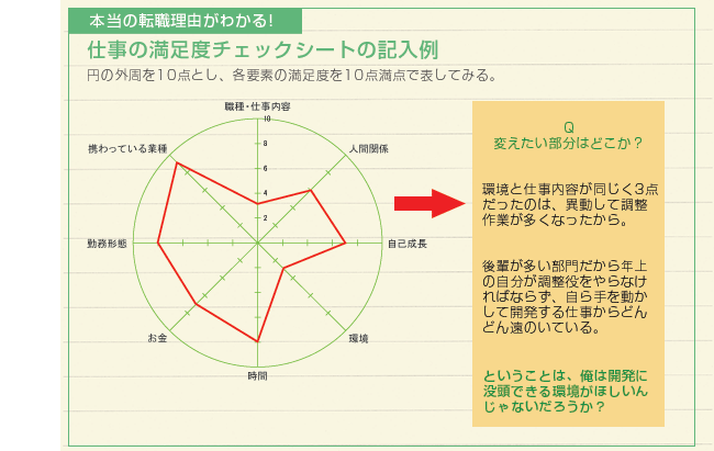 やり方はいたって簡単。「業種」や「仕事内容」「お金」など8つの項目についての現状を10点満点で自己採点していき、それを線で結ぶ。そして、もっとも点が低かった項目について、具体的に何を変えれば満足するかを書き出してみる。「紙に描かなくても自覚している」と感じる人もいるだろうが、そうではないと小田さんはいう。