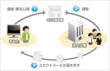 あなたのスキル・経験を匿名で公開することで、あなたに興味を持った企業の人事担当者から直接スカウトメールが届くサービスです。様々な企業が利用しているため、転職の可能性が広がります。